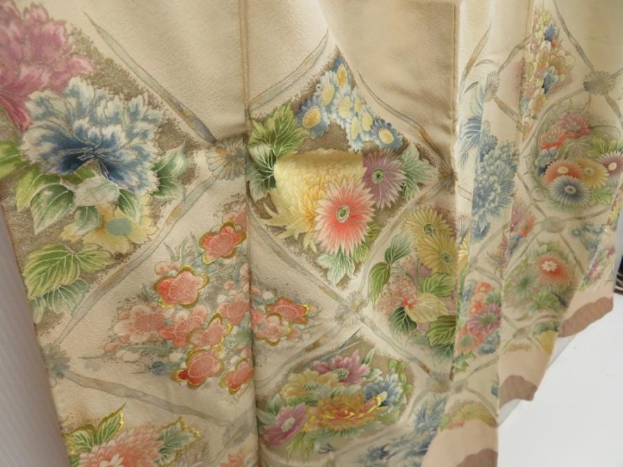 5013T11z800 Vintage Japanese Kimono Silk TSUKESAGE Flowers Champagne