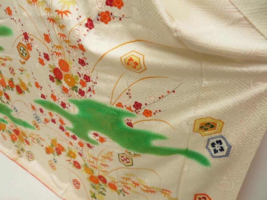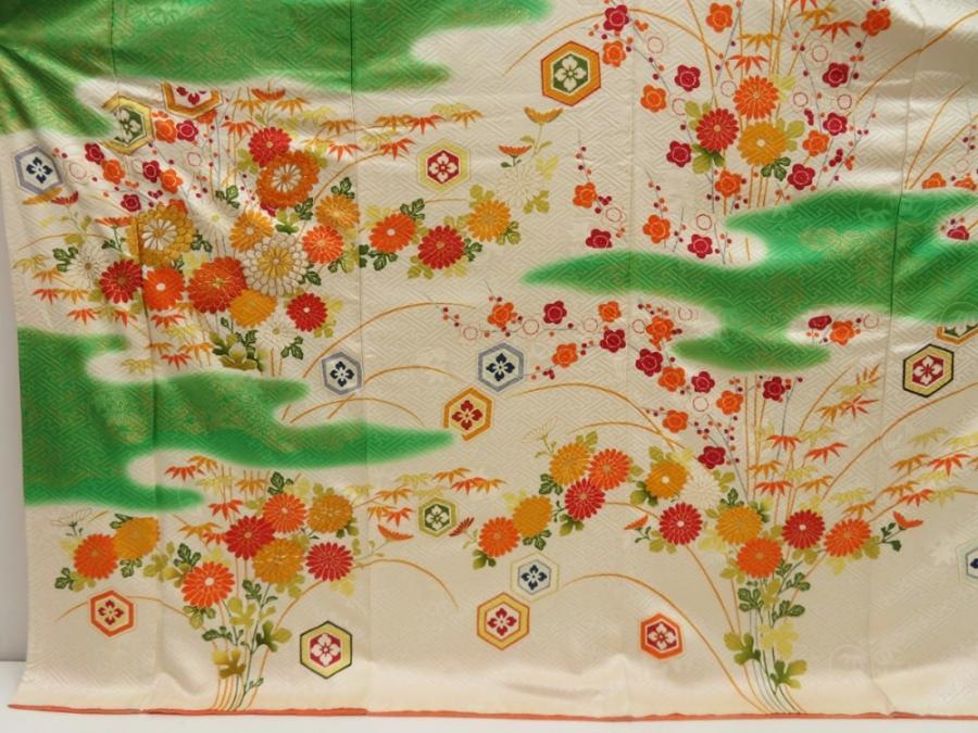 5702T04z1120 Vintage Japanese Kimono Silk FURISODE Chrysanthemum Off-white