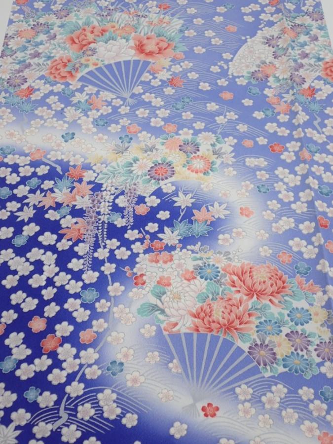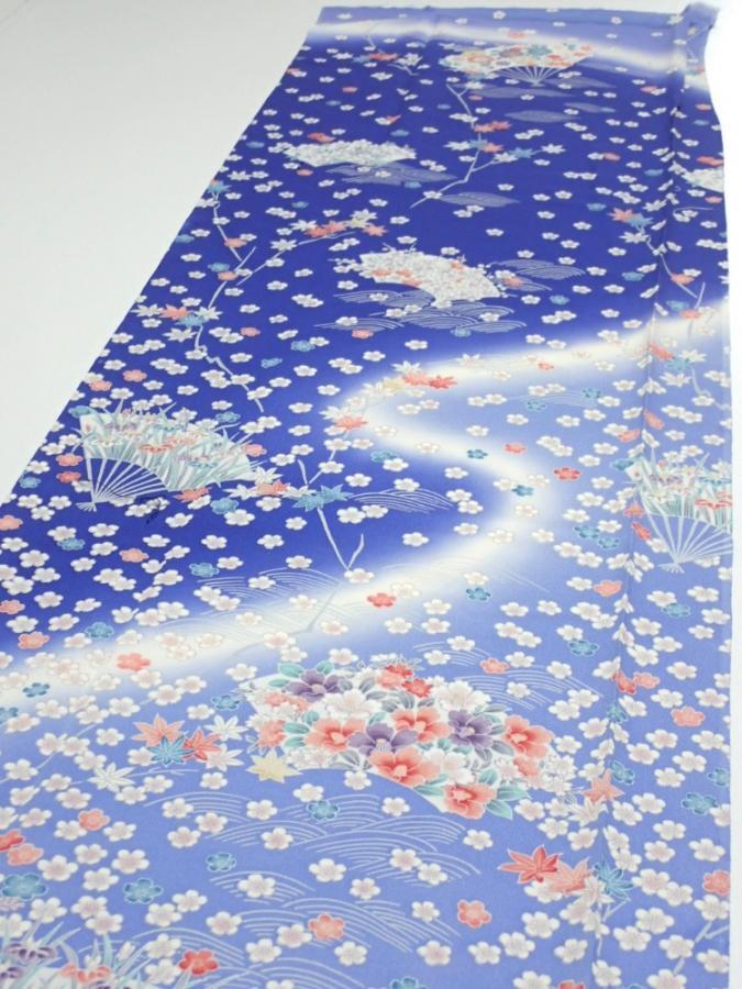 1K03z90 Japanese Kimono Silk FABRIC Flowers Blue 65.0x14.8