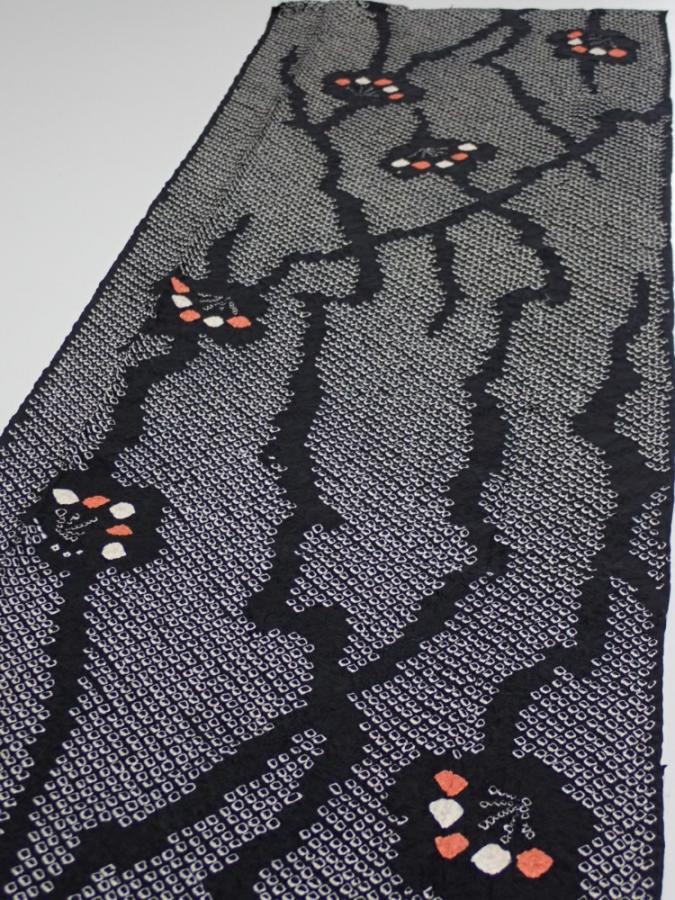 1K04z70 Japanese Kimono Silk SHIBORI FABRIC Plum branch Black 66.5x14.6