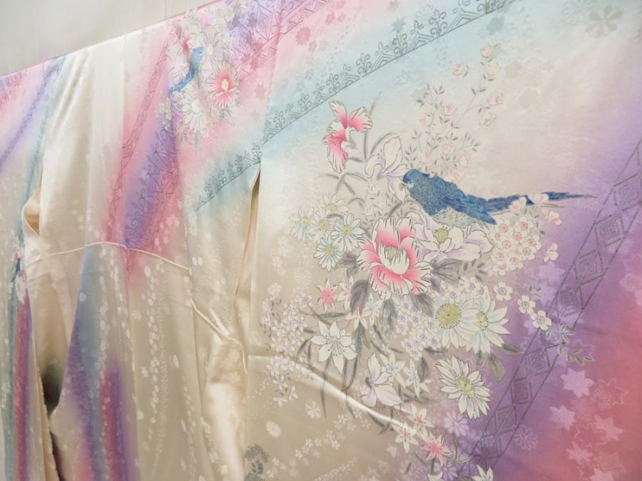 5716T14z1230 Vintage Japanese Kimono Silk FURISODE Flowers Off-white