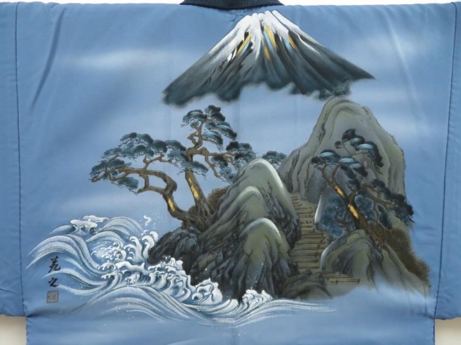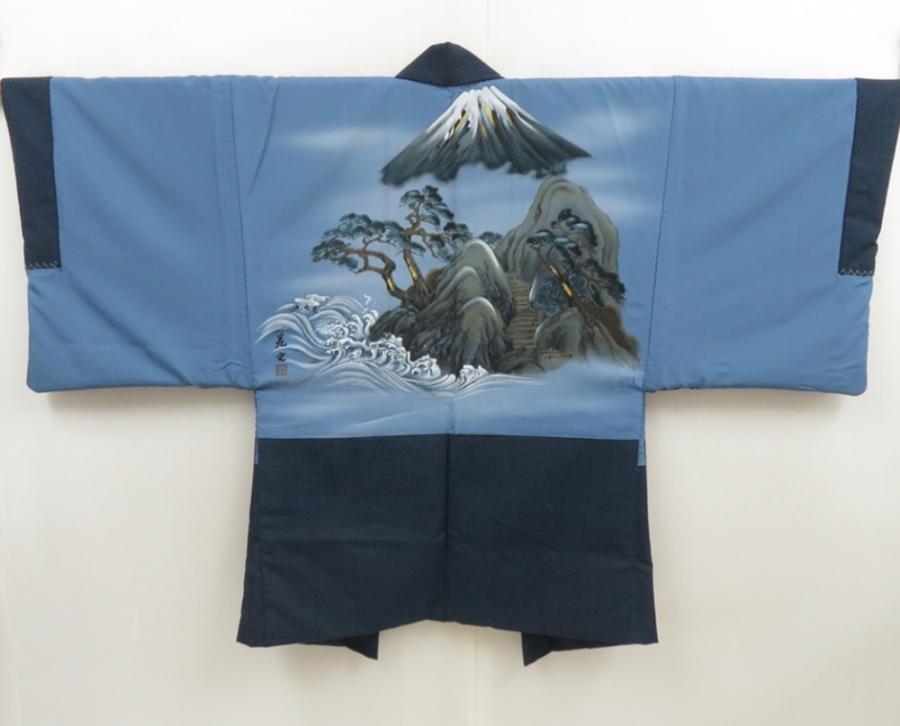 5722T01z870 Vintage Japanese Kimono Wool Men's HAORI Mt.Fuji Blue-Gray
