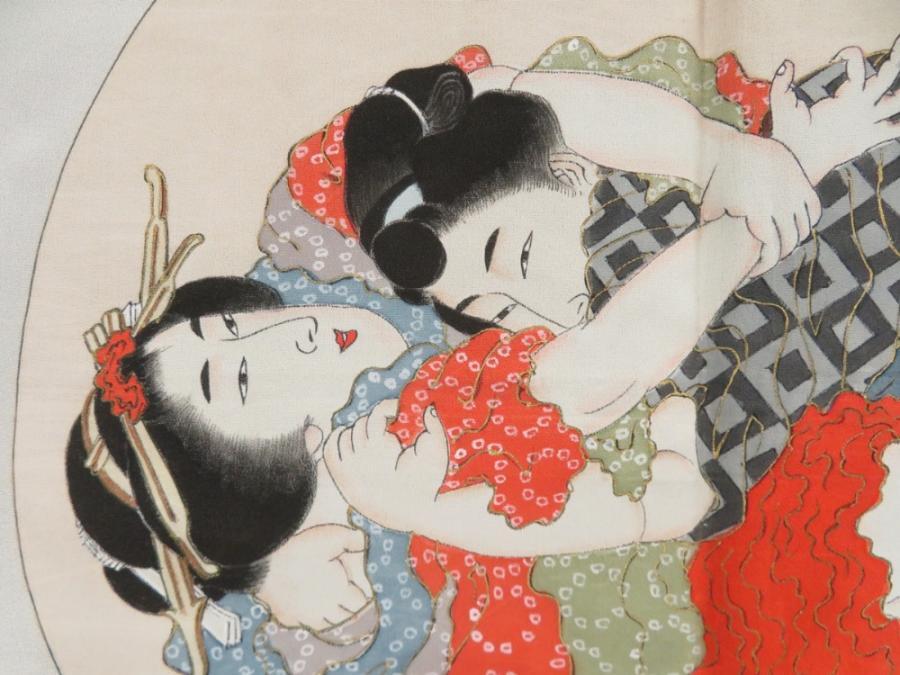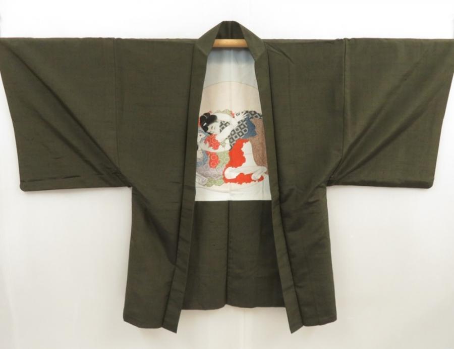 5726T07z670 Vintage Japanese Kimono Silk Men's HAORI 春画 Green-Gray
