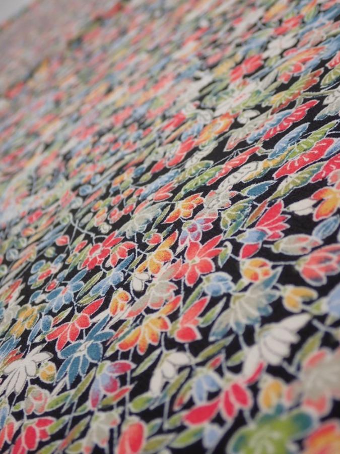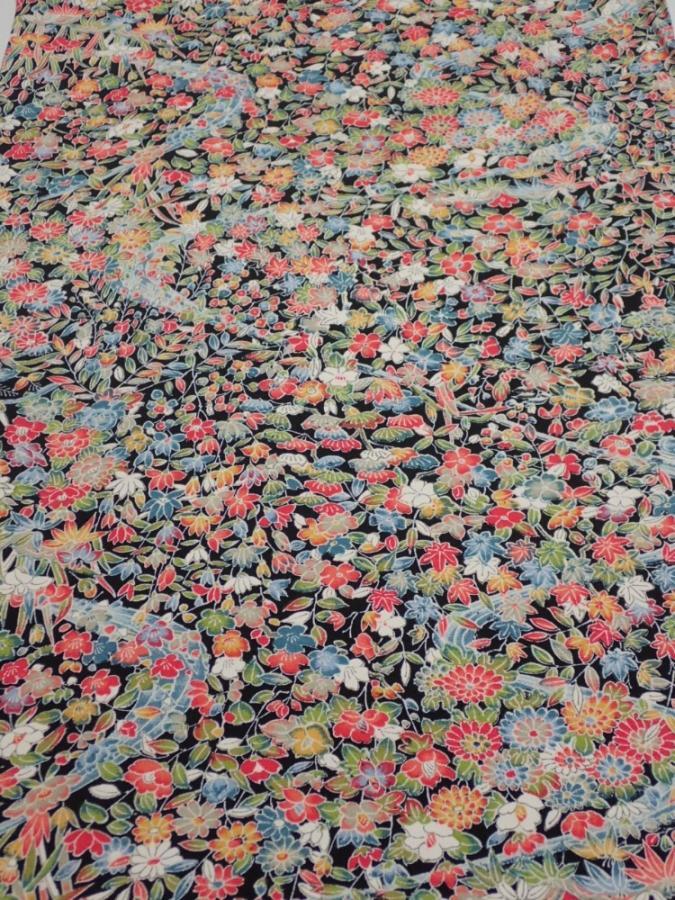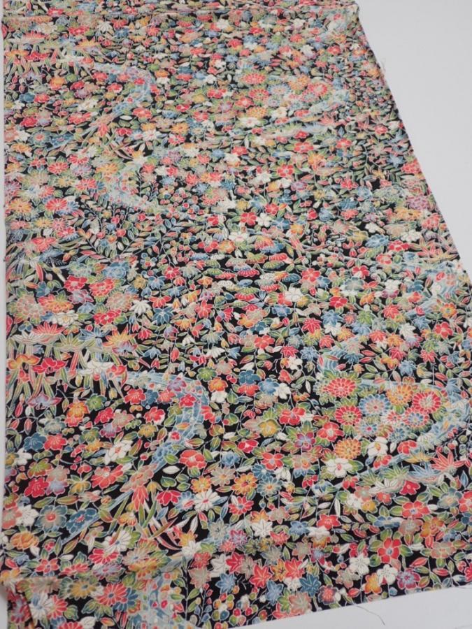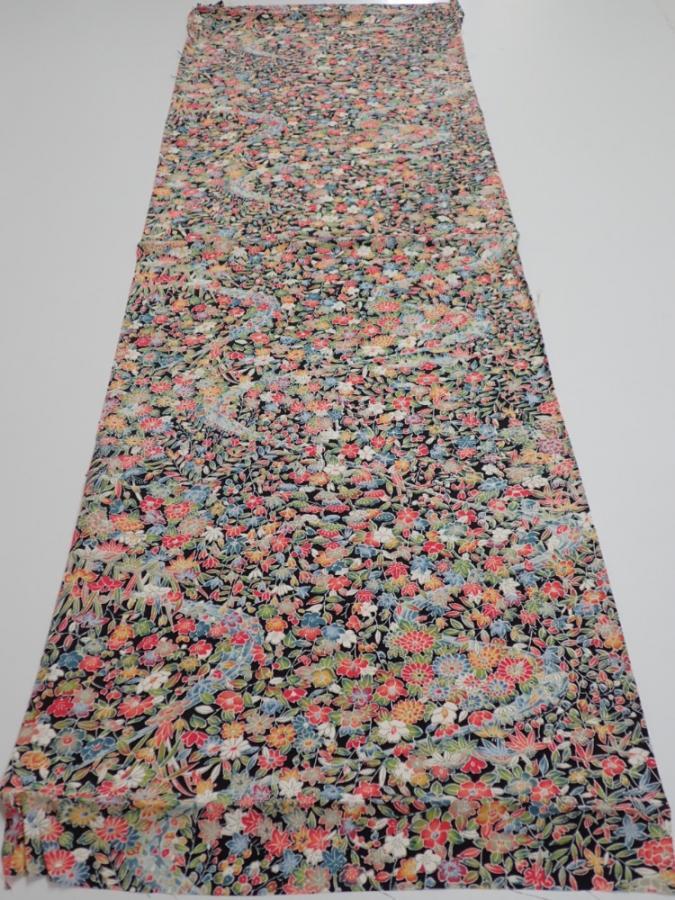 2K01z60 Japanese Kimono Silk FABRIC Flowers Black 41.7x14.4