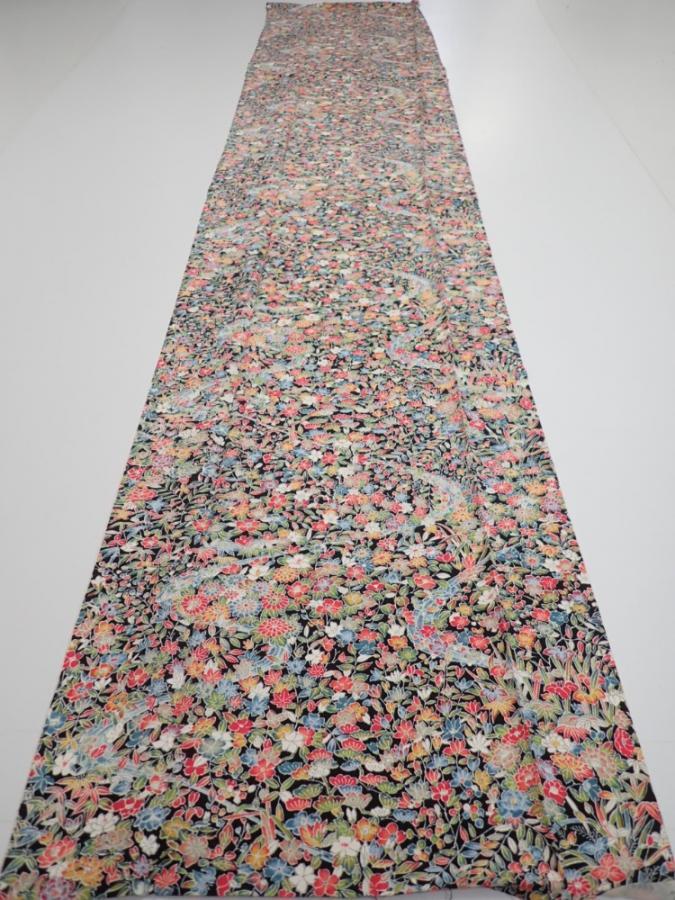 2K05z90 Japanese Kimono Silk FABRIC Flowers Black 66.9x14.6