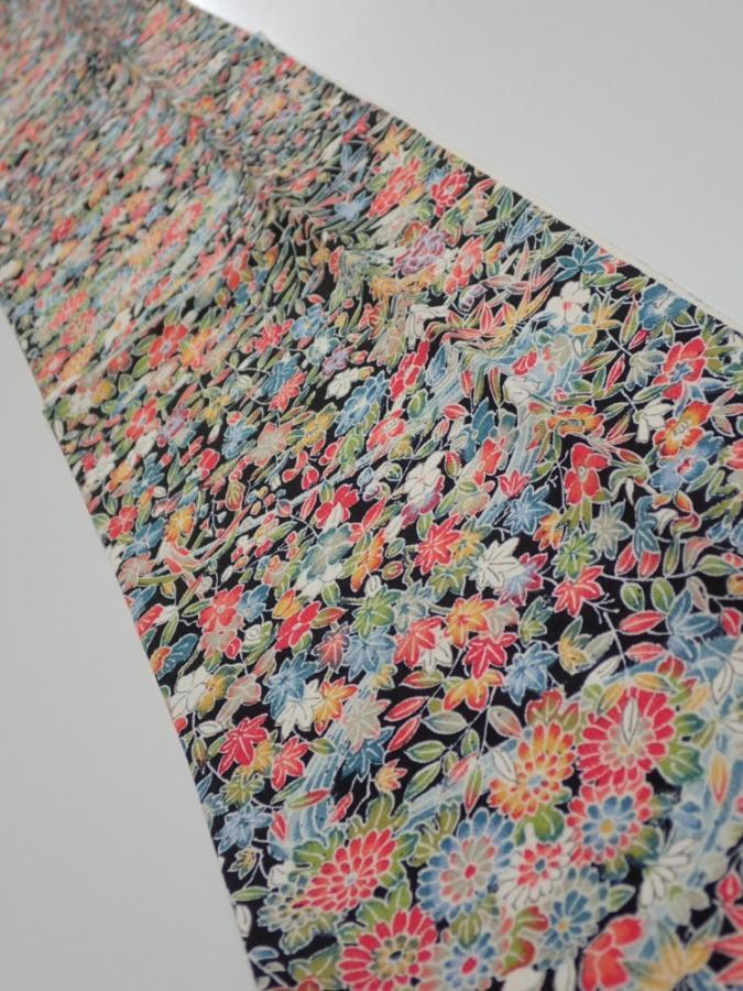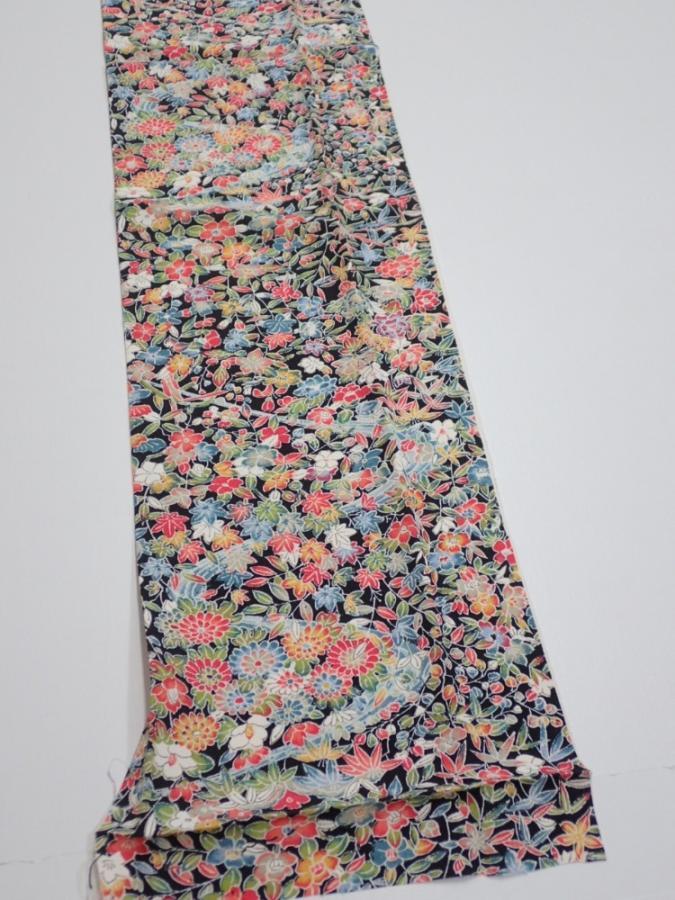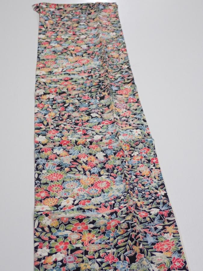 2K10z30 Japanese Kimono Silk FABRIC Flowers Black 37.0x6.9