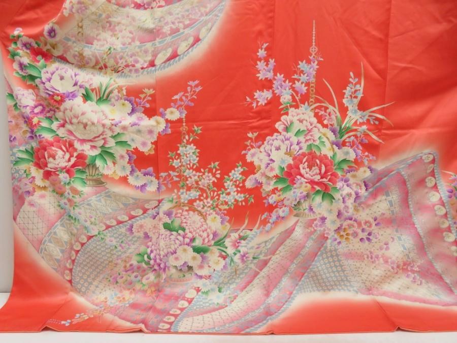 5806T13z1130 Vintage Japanese Kimono Silk FURISODE Flowers Dark salmon