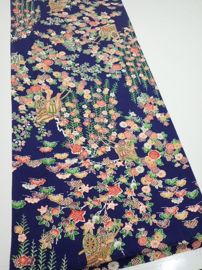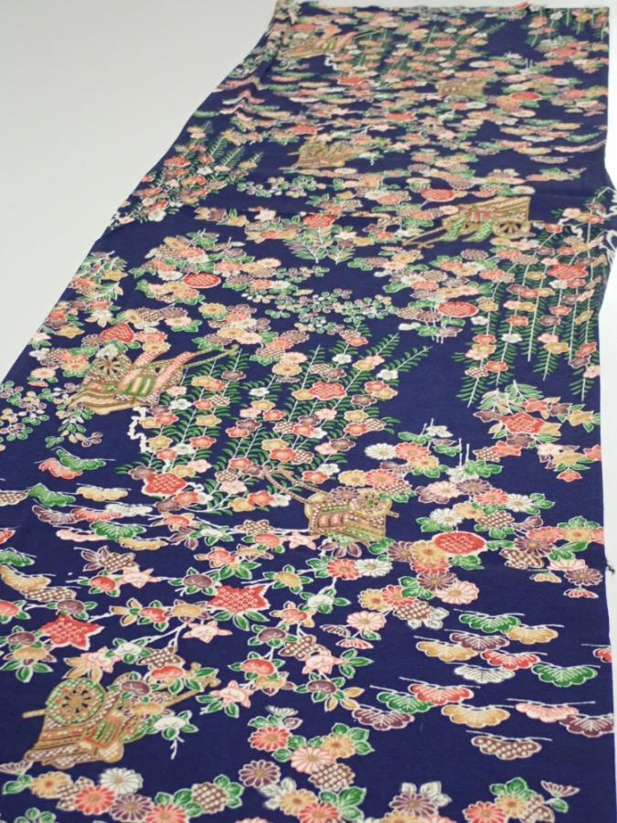 1G06z100 Japanese Kimono Silk FABRIC Flowers Navy 68.1x14.2