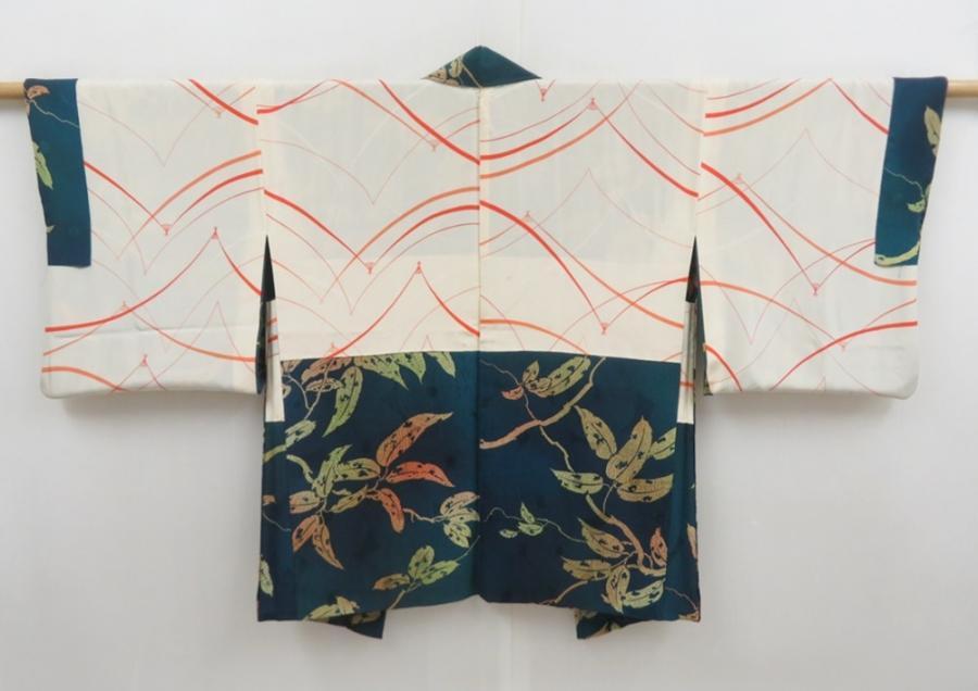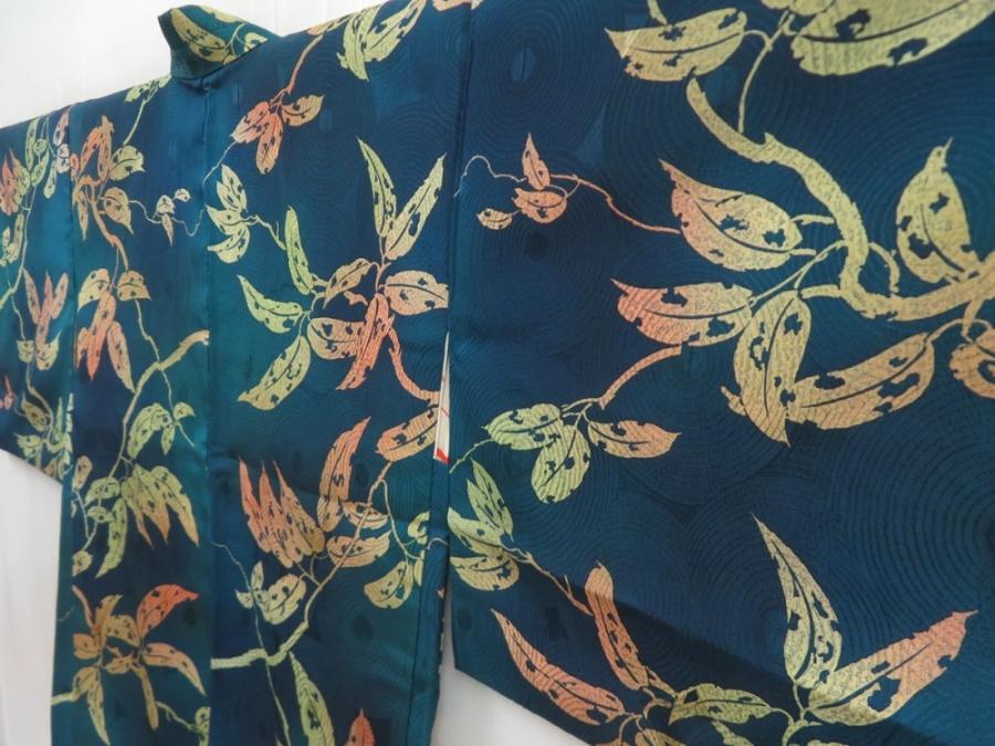 5814T11z560 Vintage Japanese Kimono Silk HAORI Leaf Dark cyan
