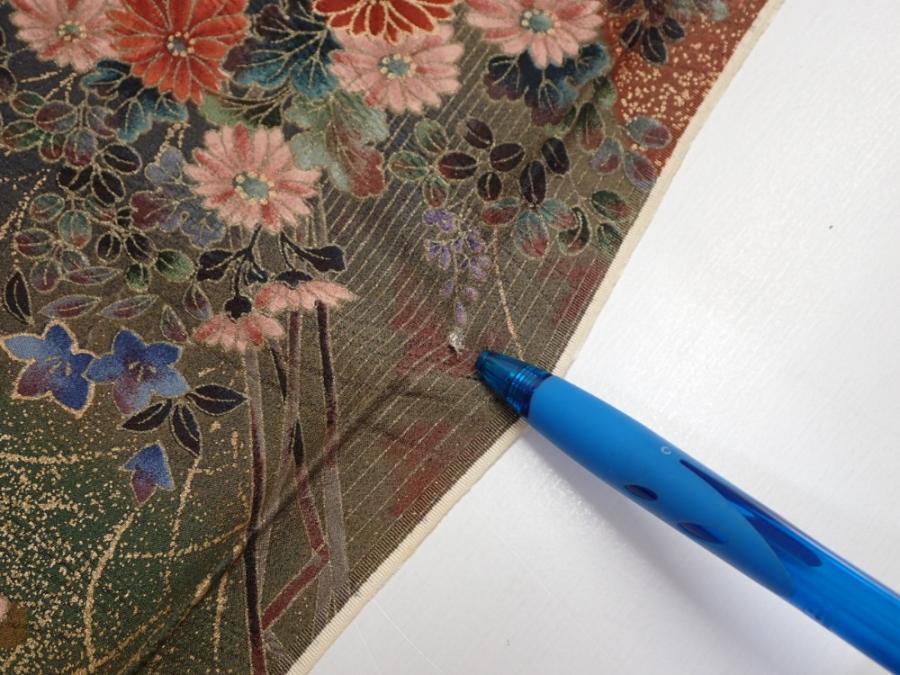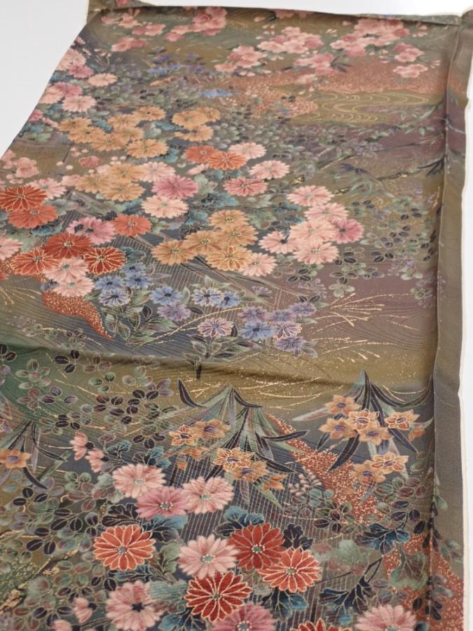 2W02z40 Japanese Kimono Silk FABRIC Flowers Dark olive 38.6x14.2