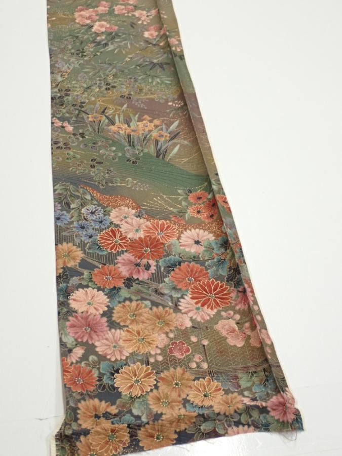 2W08z30 Japanese Kimono Silk FABRIC Flowers Dark olive 55.5x7.3