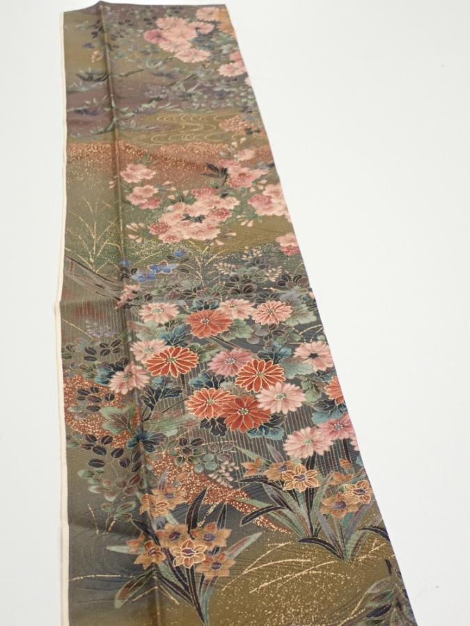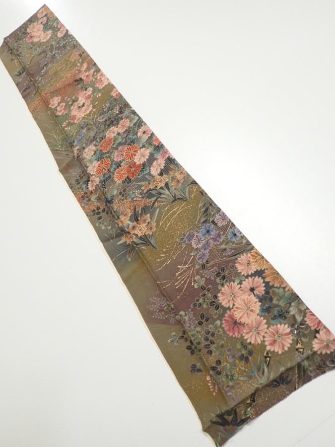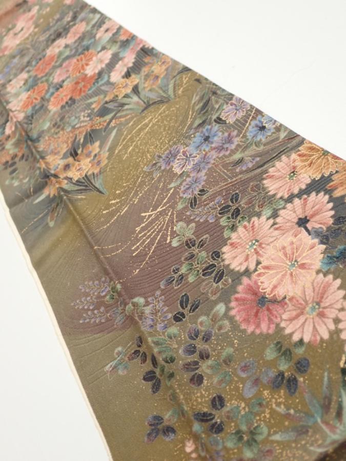 2W10z20 Japanese Kimono Silk FABRIC Flowers Dark olive 35.0x6.7