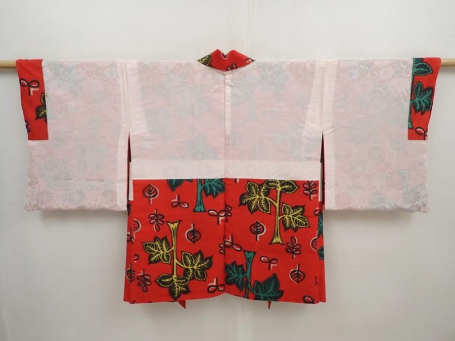 5907T07z420 Vintage Japanese Kimono Silk MEISEN HAORI Leaves Red
