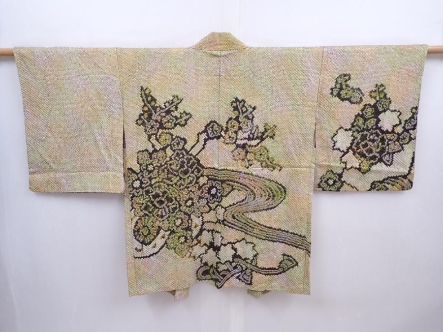 5911T07z530 Vintage Japanese Kimono Silk SHIBORI HAORI Flowers Olive