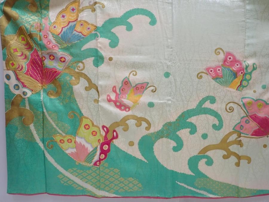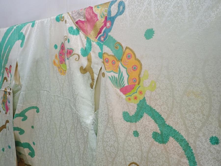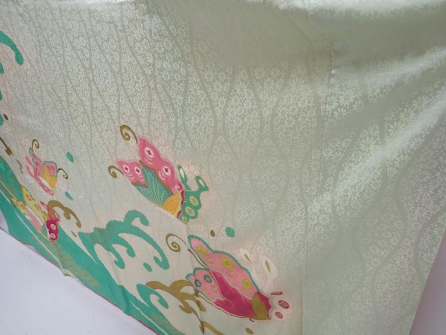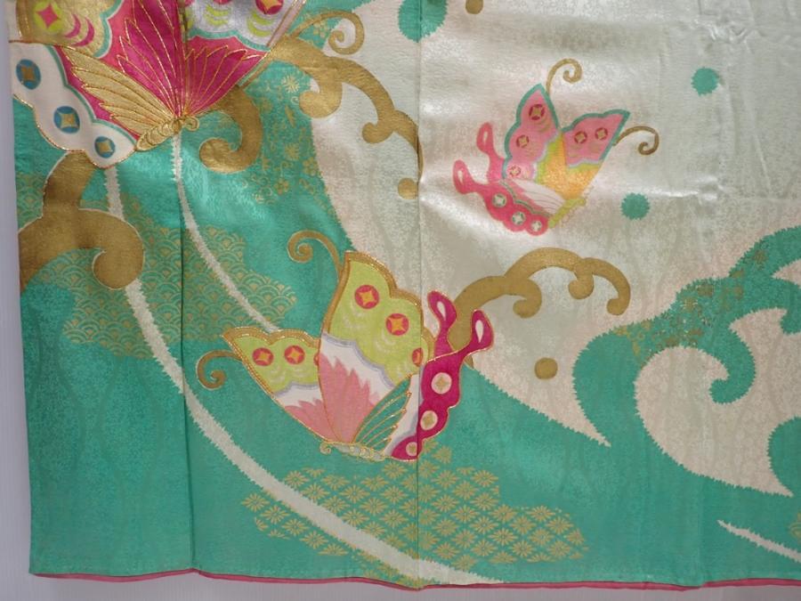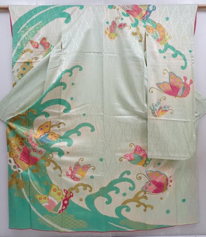 5911T10z930 Vintage Japanese Kimono Silk FURISODE Butterfly Celadon