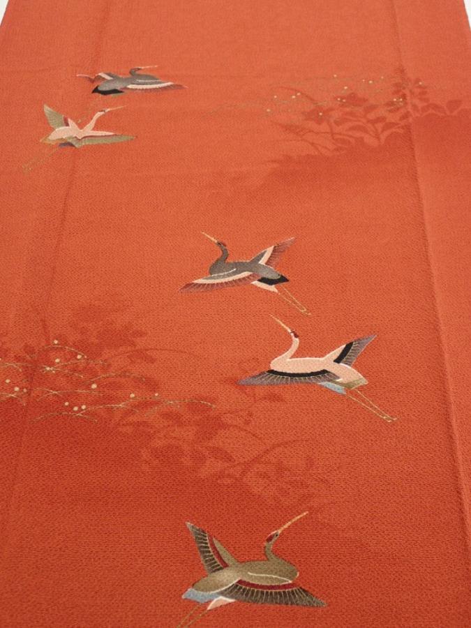 1J04z100 Japanese Kimono Crepe Silk FABRIC Flying crane Dark orange 65.4x14.4