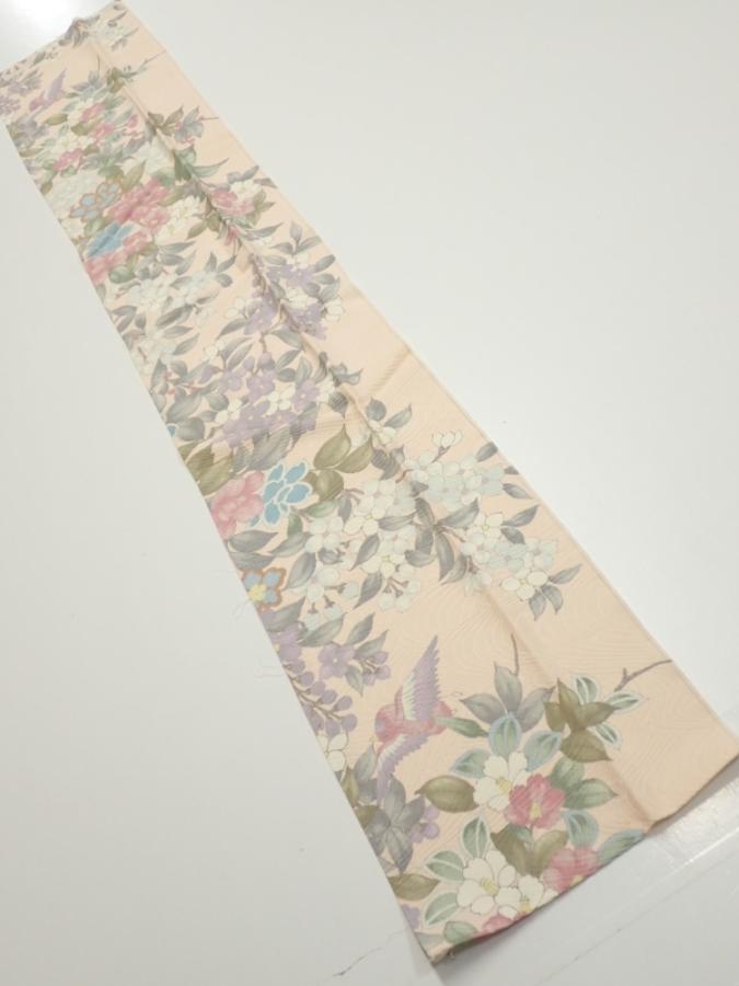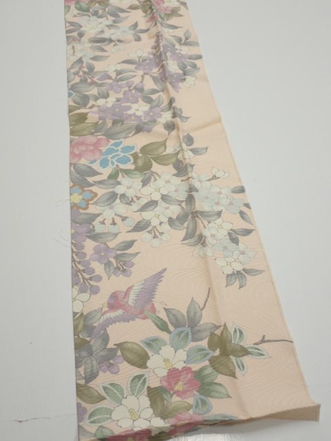 1J10z30 Japanese Kimono Silk FABRIC Bird Flower Light peach 38.2x7.1