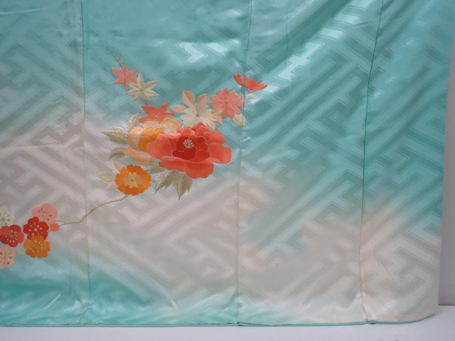 5913T14z1120 Vintage Japanese Kimono Silk FURISODE Royal cart Dull cyan