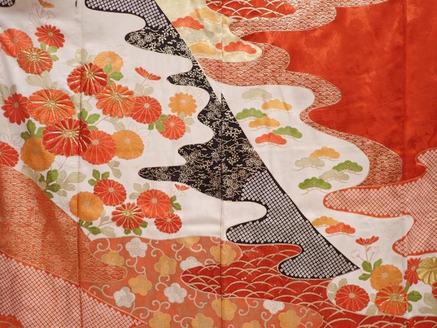 5914T14z1020 Vintage Japanese Kimono Silk FURISODE Chrysanthemum Orange-Red
