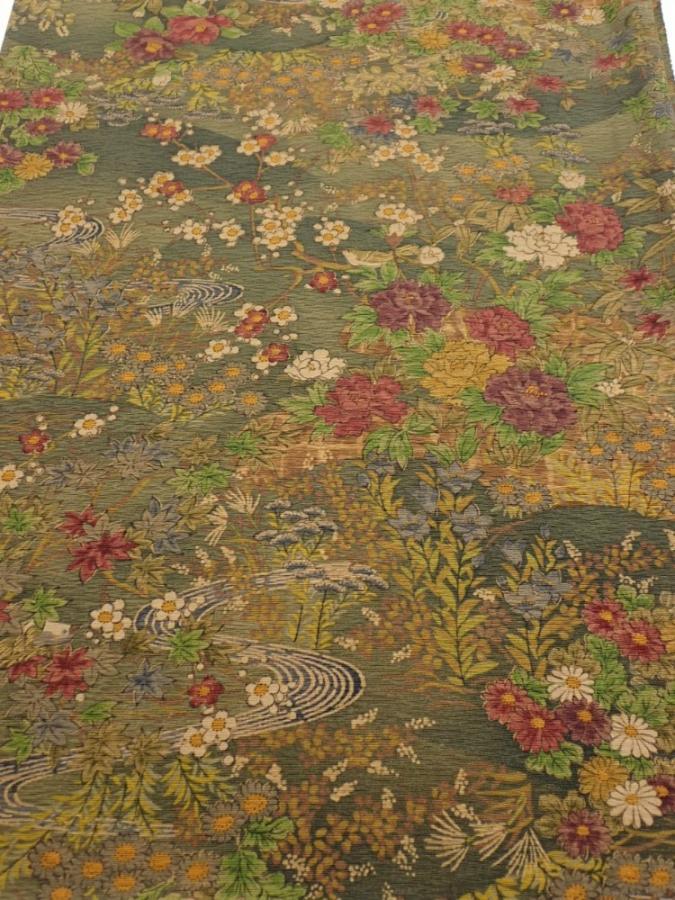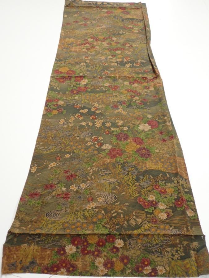2E02z70 Japanese Kimono Silk FABRIC Flowers Dark olive 44.1x14.6
