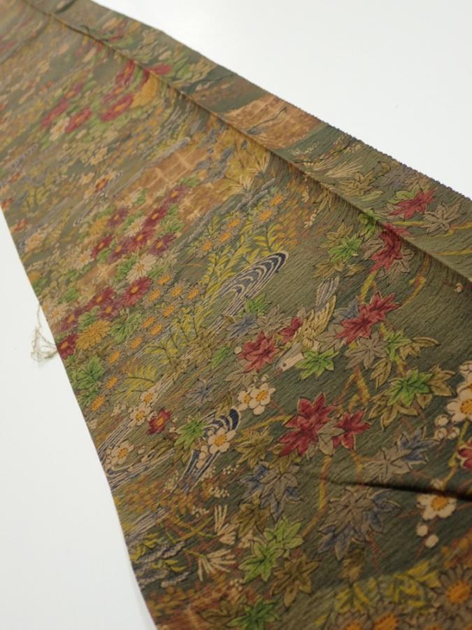 2E08z50 Japanese Kimono Silk FABRIC Flowers Dark olive 64.2x7.7