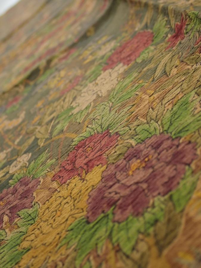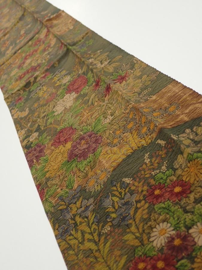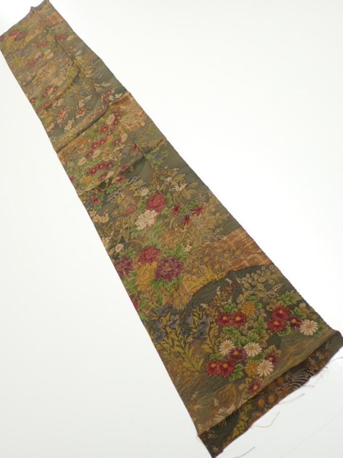 2E10z30 Japanese Kimono Silk FABRIC Flowers Dark olive 39.0x6.7