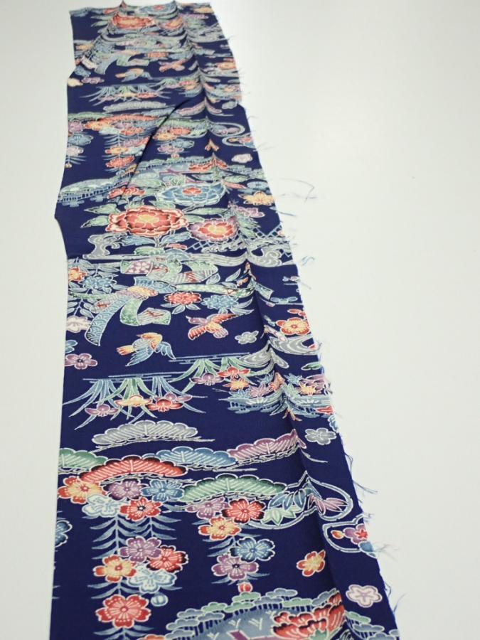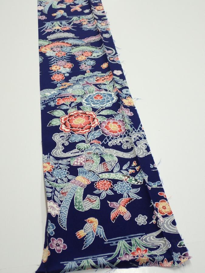 2E08z50 Japanese Kimono Silk FABRIC Bird, Flowers Dark navy 61.4x7.9