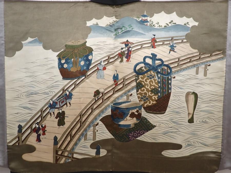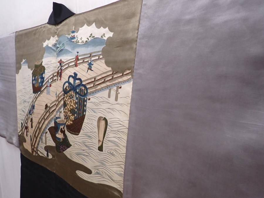 5920T04z620 Vintage Japanese Kimono Silk Men's HAORI Bridge Black