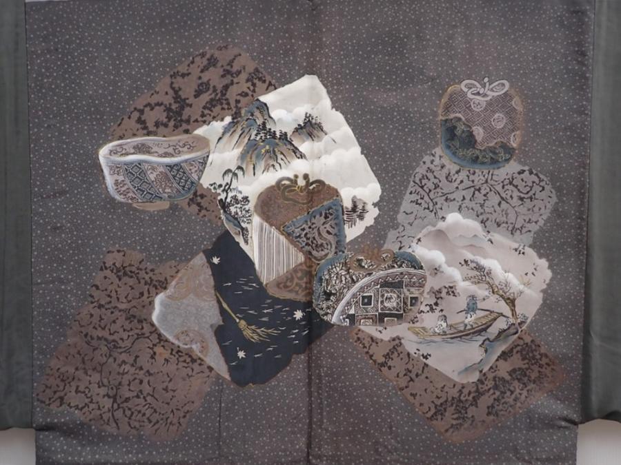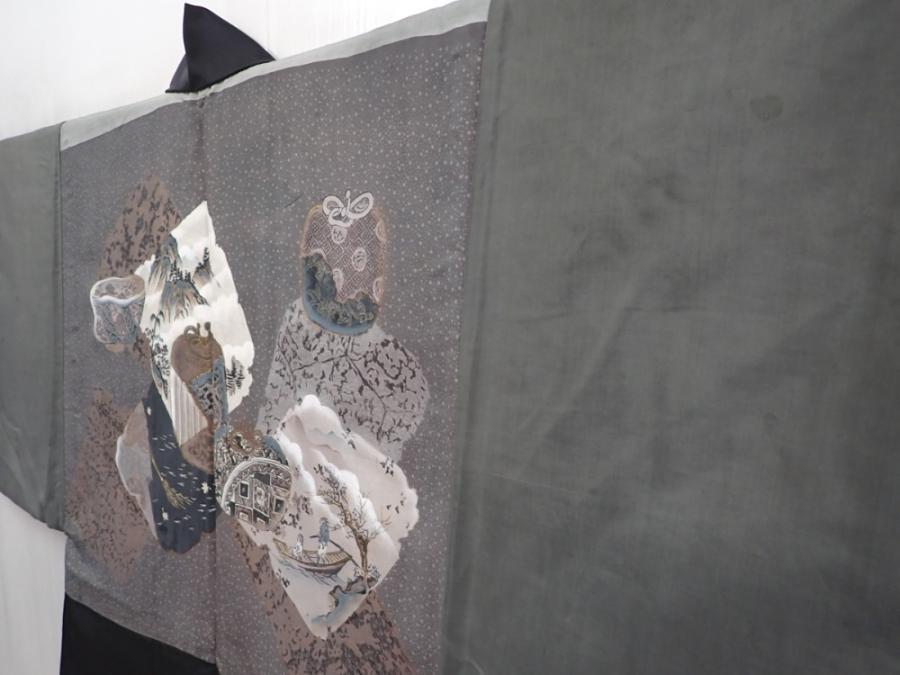 5920T08z500 Vintage Japanese Kimono Silk Men's HAORI Scenery Black