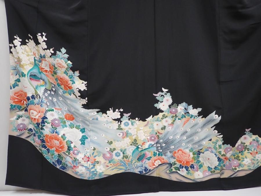 5926T08z1560 Vintage Japanese Kimono Silk TOMESODE Peacock Black