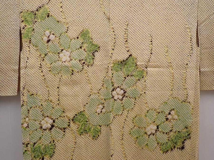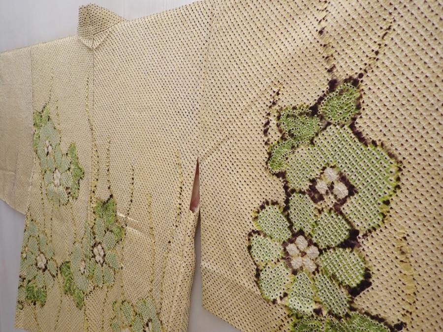 5915T08z410 Vintage Japanese Kimono Silk SHIBORI HAORI Flower Straw