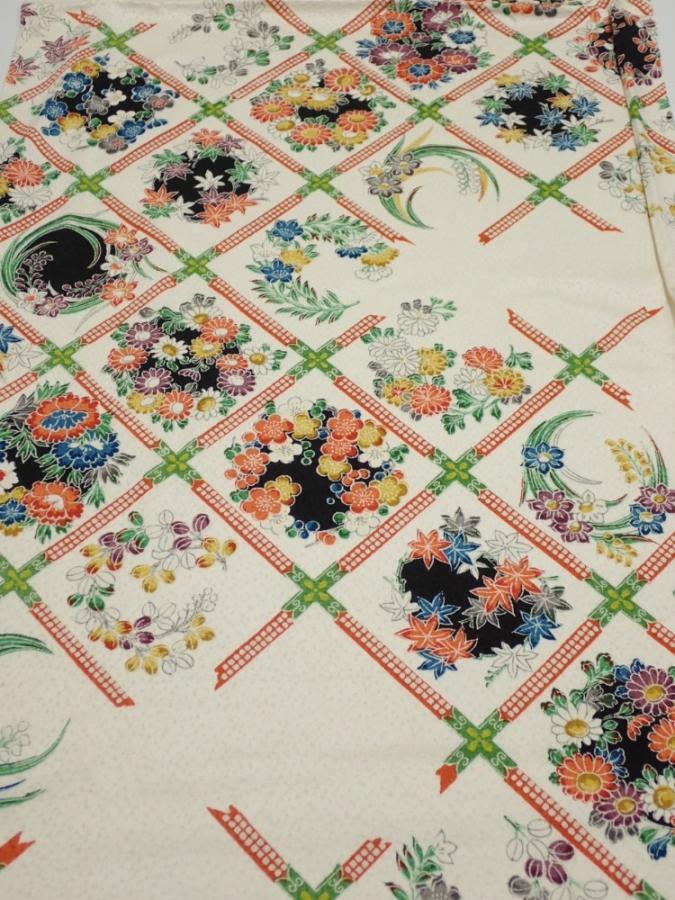 4B02z60 Japanese Kimono Silk FABRIC Flowers Off-white 40.6x14.4