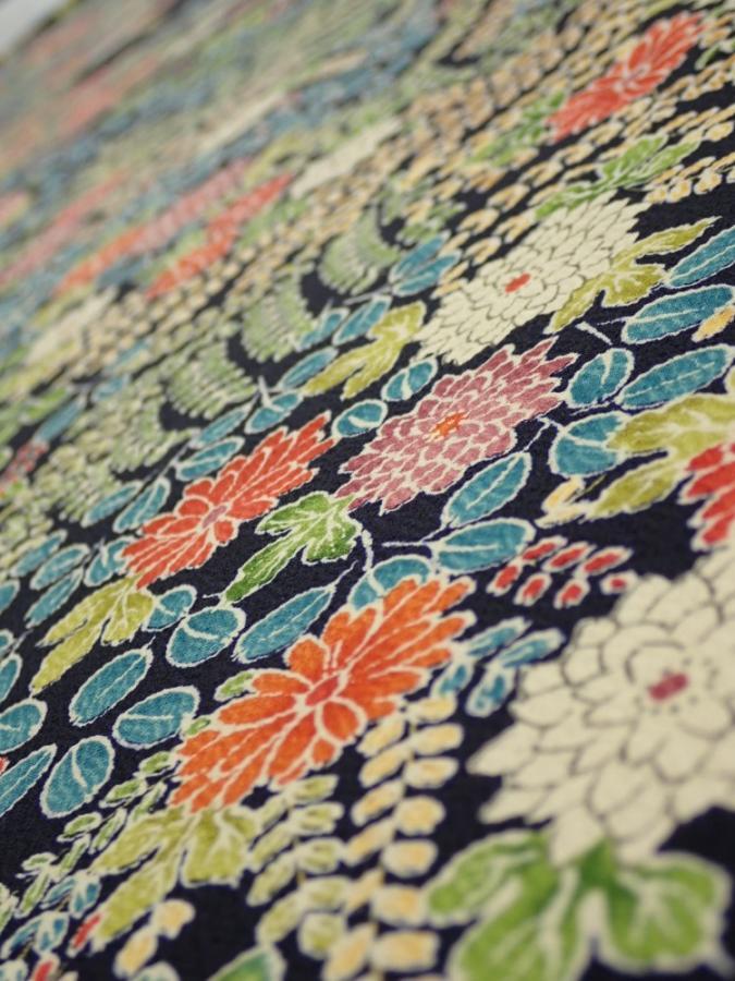 4B04z90 Japanese Kimono Silk FABRIC Flowers Dark navy 62.2x14.6