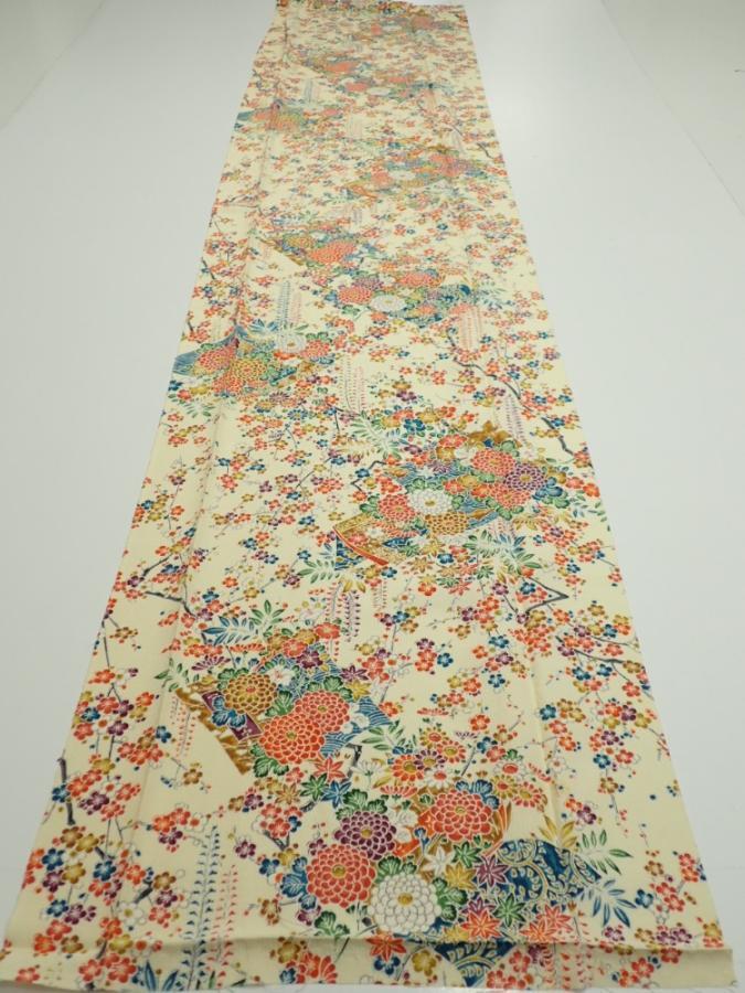 2L03z90 Japanese Kimono Silk FABRIC Flowers Light yellow 65.4x14.4