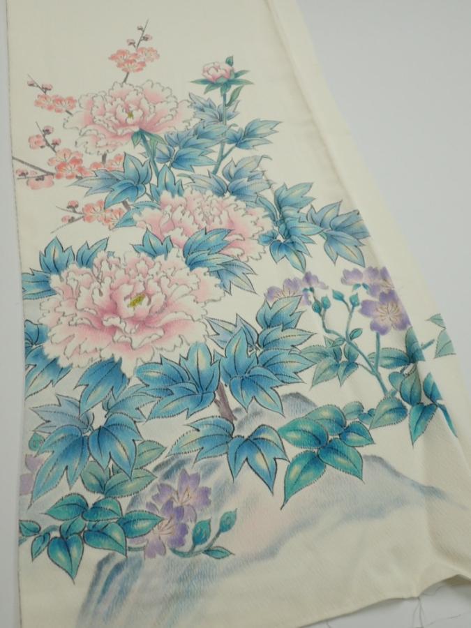 2L01z80 Japanese Kimono Silk FABRIC Flowers Off-white 56.3x14.4