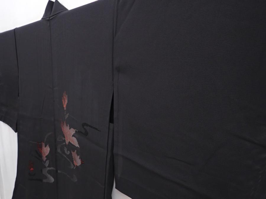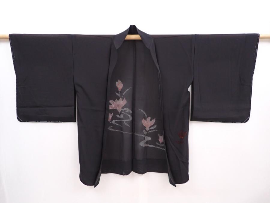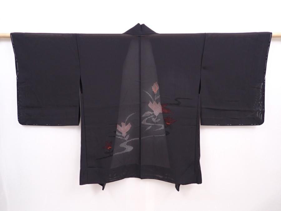 6008T08z300 Vintage Japanese Kimono Silk See through HAORI Flower Black