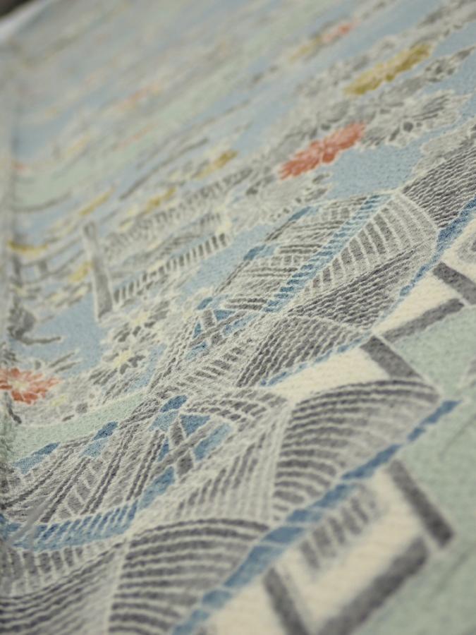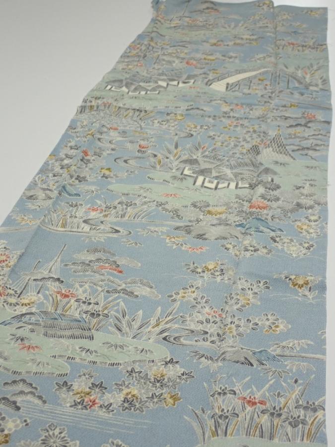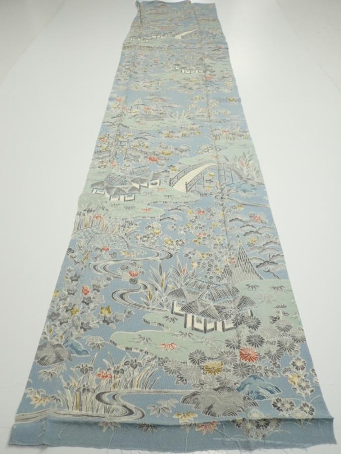 2L05z100 Japanese Kimono Crepe Silk FABRIC Scenery Dull light blue 66.1x14.0