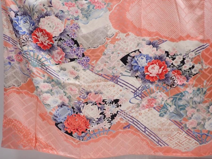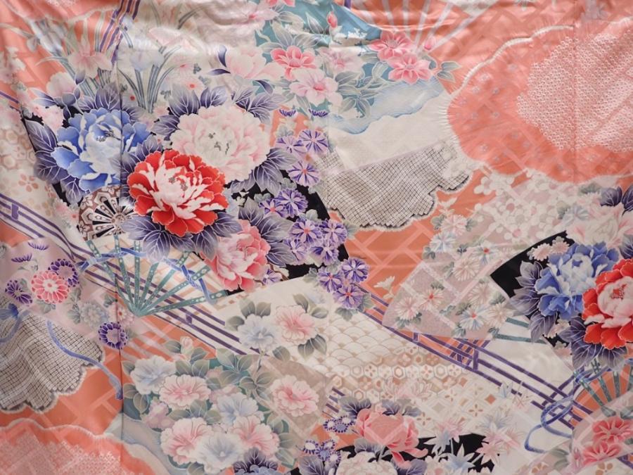 6009T12z1130 Vintage Japanese Kimono Silk FURISODE Folding fan Coral pink
