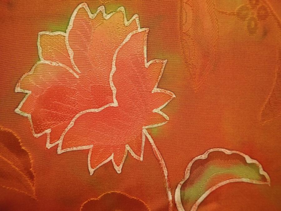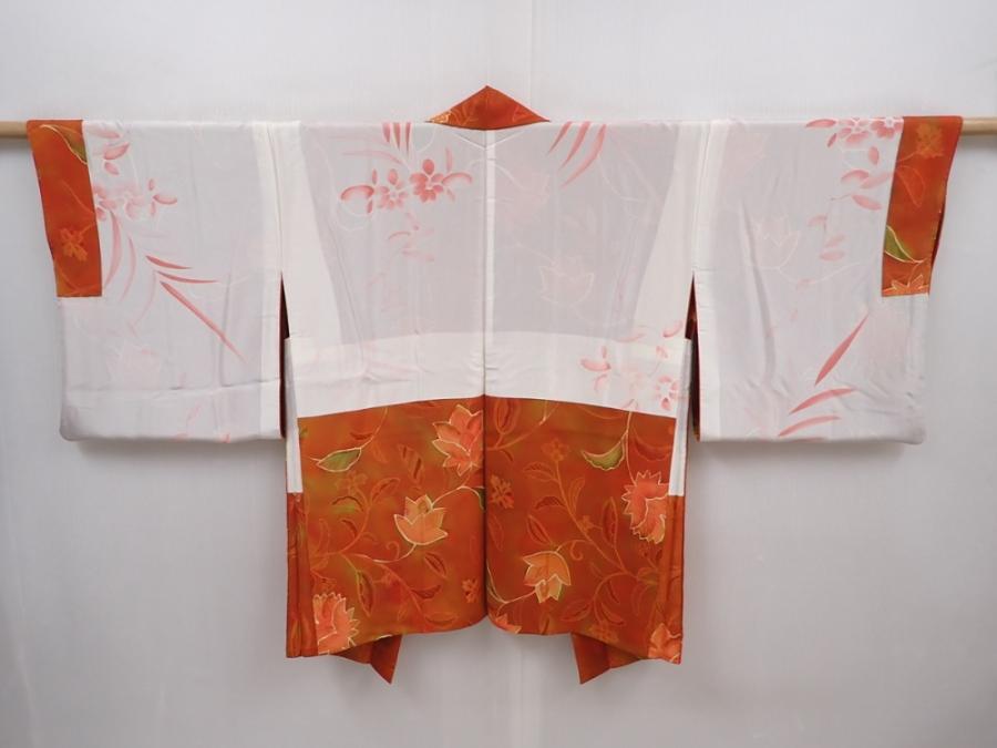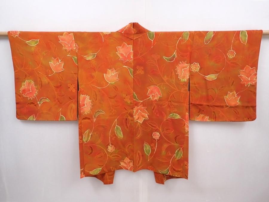 6010T01z530 Vintage Japanese Kimono Silk HAORI Flowers Dark orange