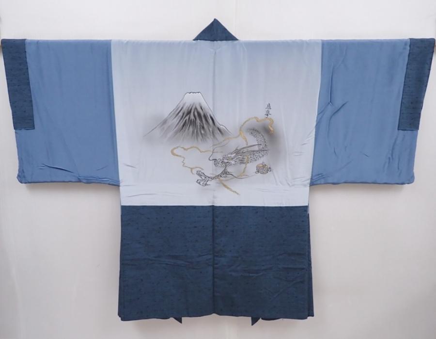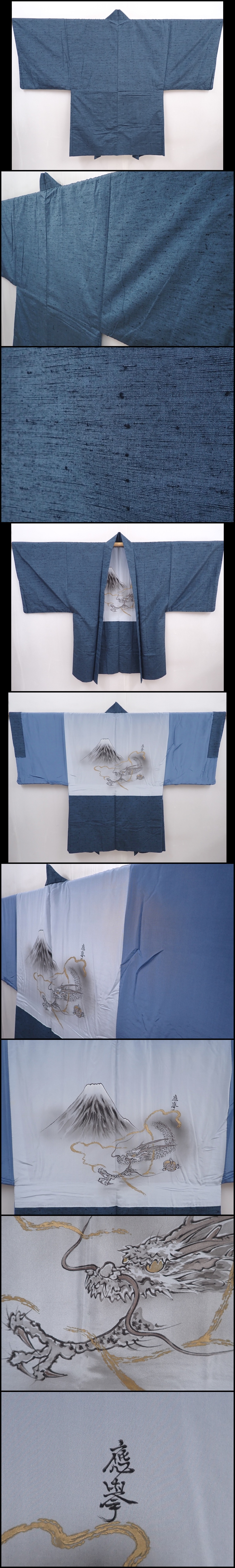 6011T02z600 Vintage Japanese Kimono Silk Men's HAORI Dragon Blue-Gray