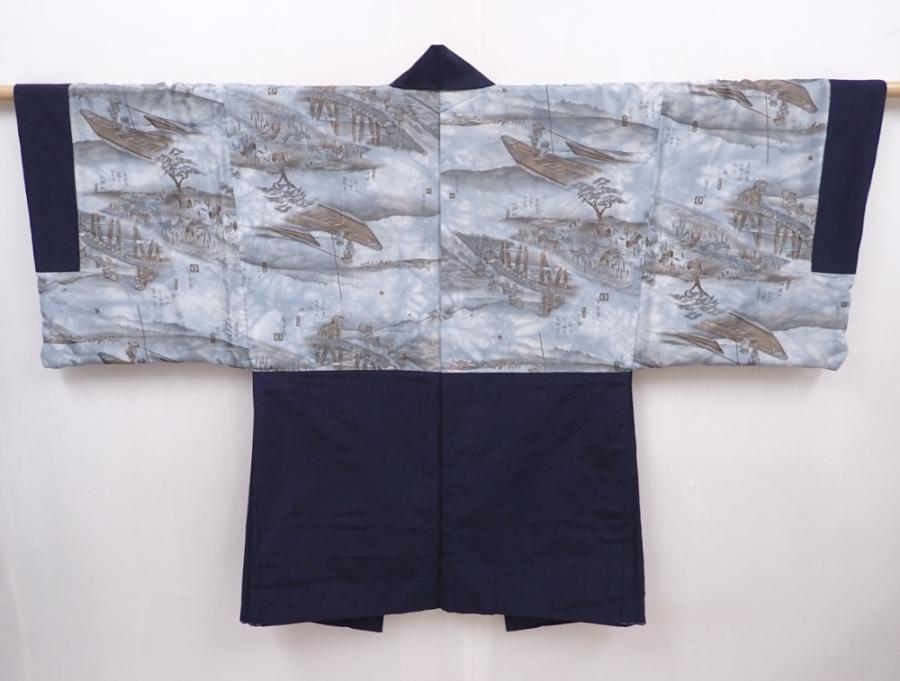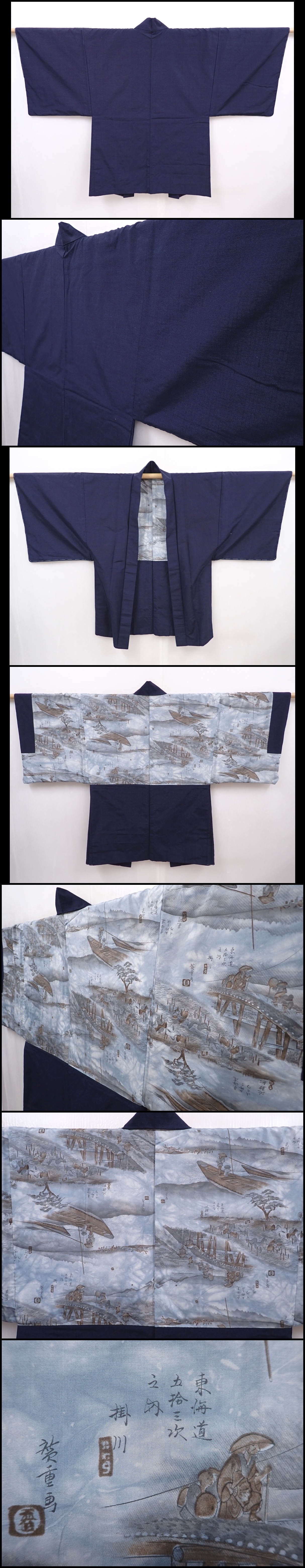 6012T11z610 Vintage Japanese Kimono Silk Men's HAORI 東海道五十三次 Dark navy