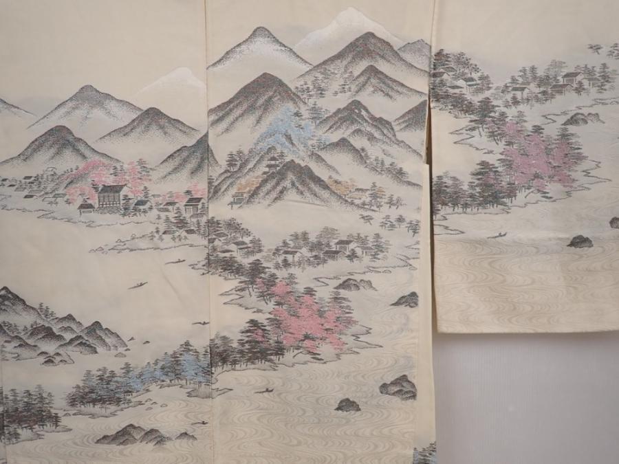 6012T13z590 Vintage Japanese Kimono Silk HAORI Scenery Off-white