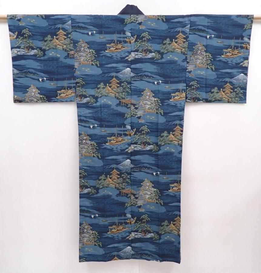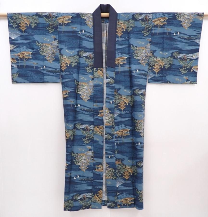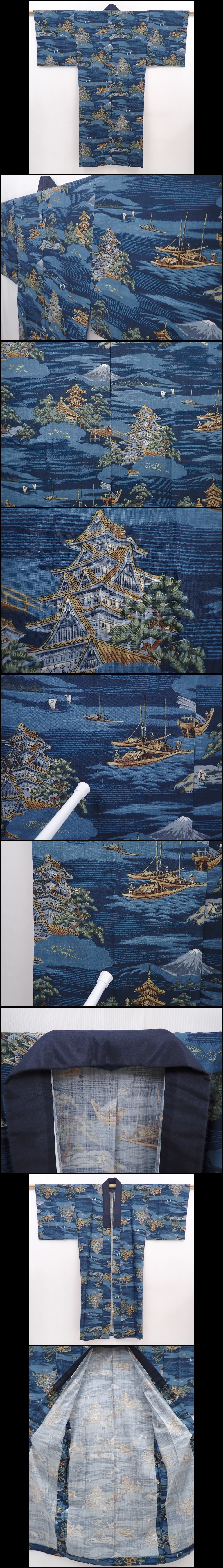 6015T13z470 Vintage Japanese Kimono Muslin Men's JUBAN Castle Navy