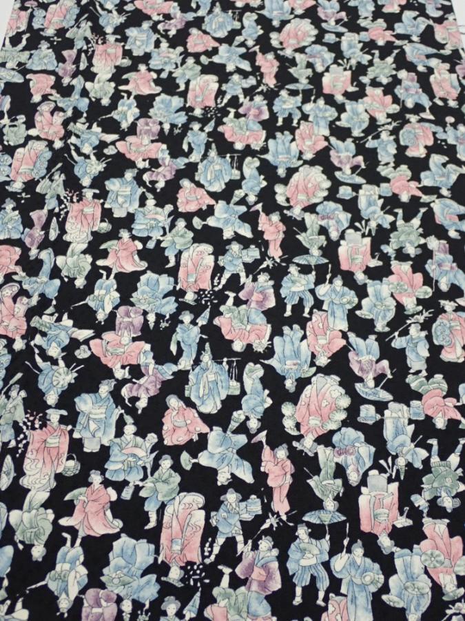 3D05z70 Japanese Kimono Silk FABRIC Edo era people Black 62.2x14.2
