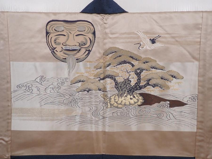 6023T05z820 Vintage Japanese Kimono Silk Men's HAORI Noh mask Dark blue