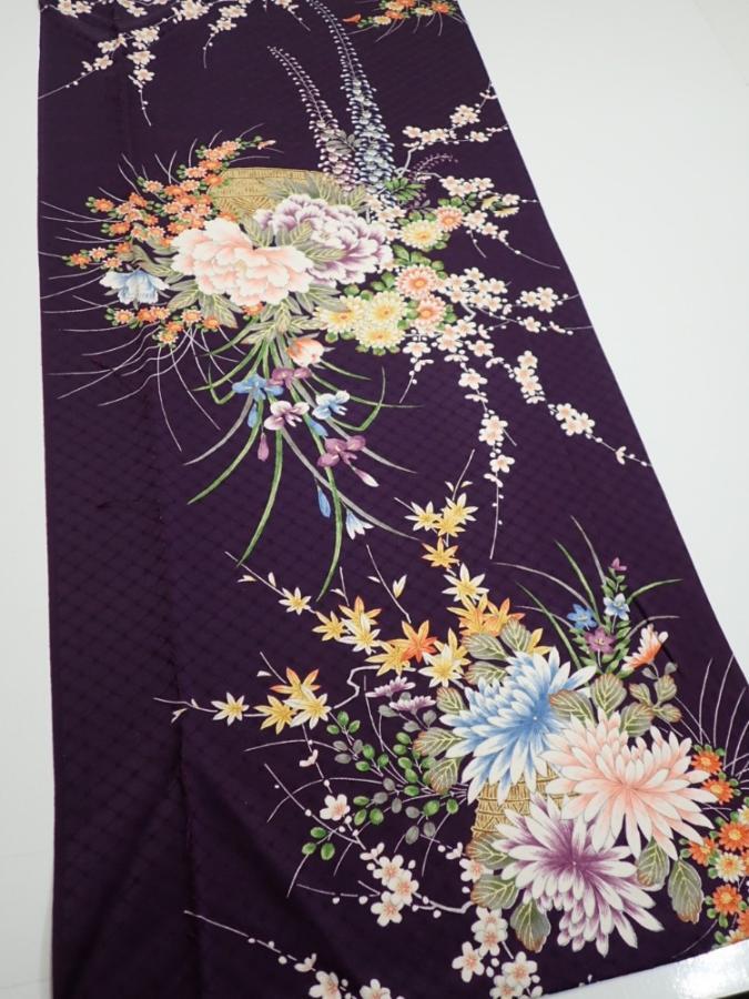 4C03z100 Japanese Kimono Silk FABRIC Flowers Dark purple 70.5x14.8