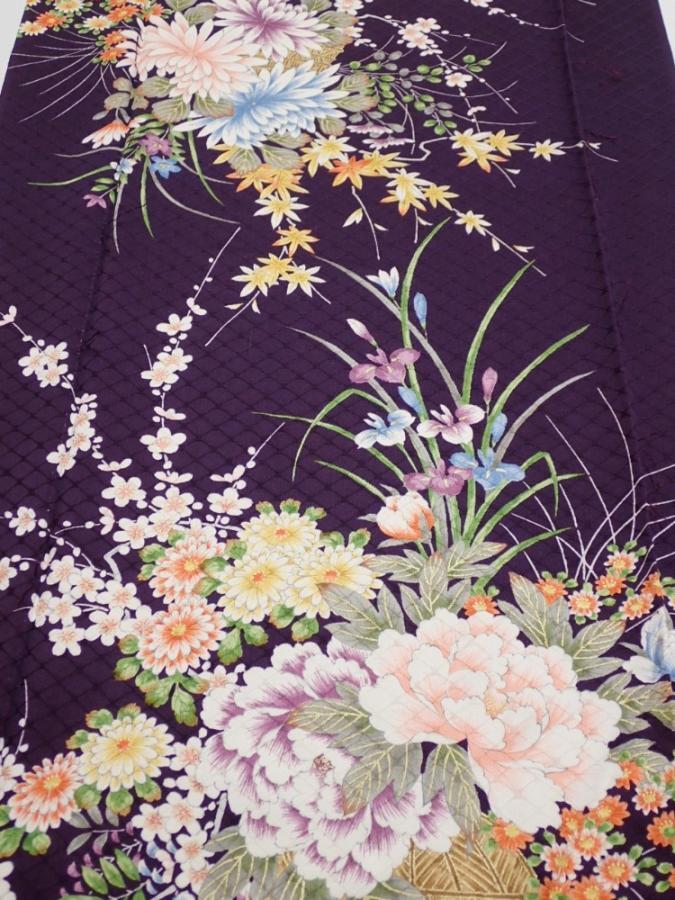 4C05z100 Japanese Kimono Silk FABRIC Flowers Dark purple 69.7x14.8