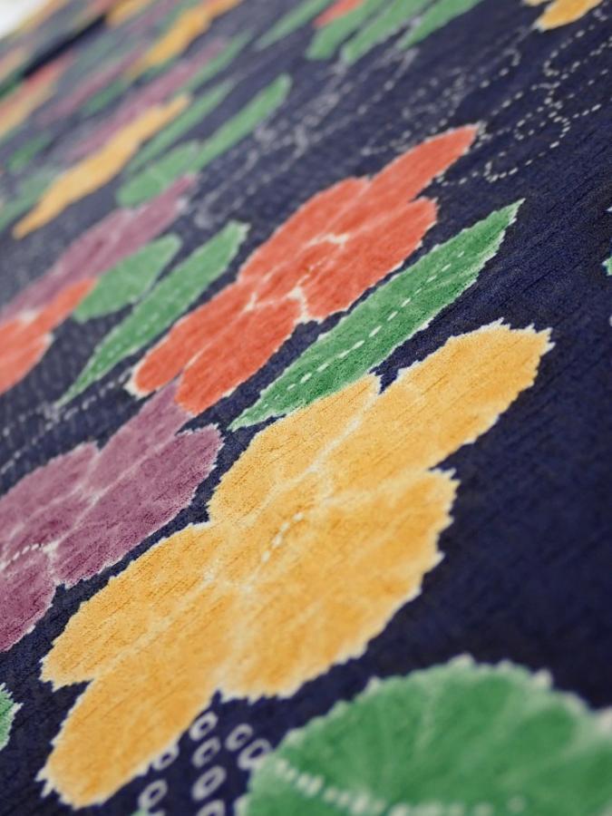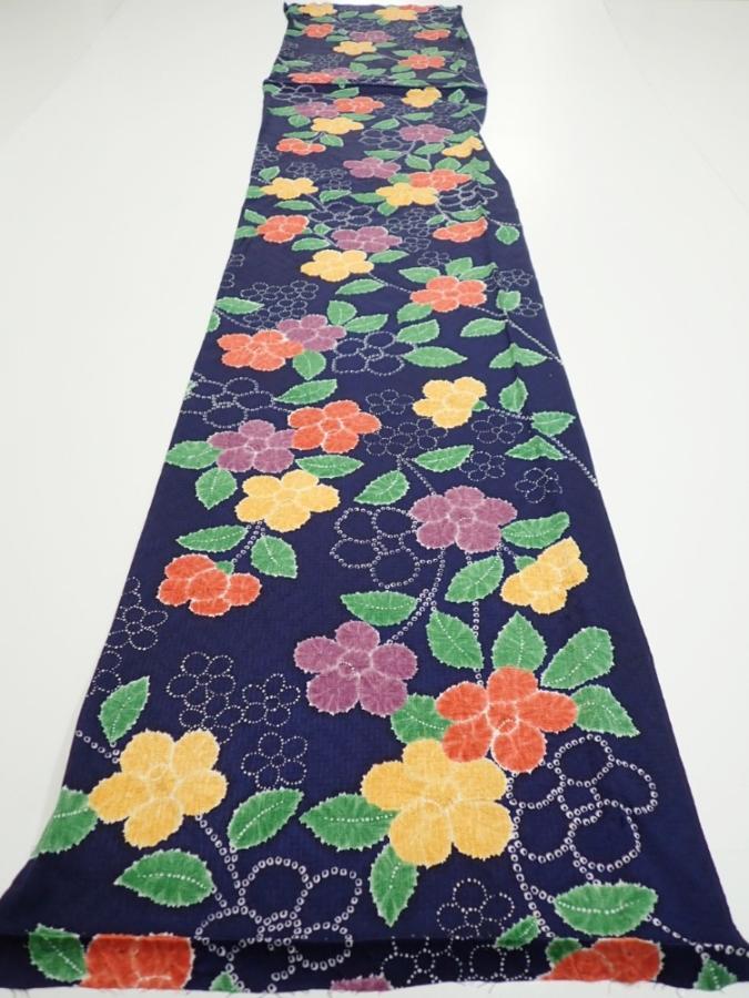3P06z90 Japanese Kimono Silk FABRIC Flower Navy 65.4x13.8
