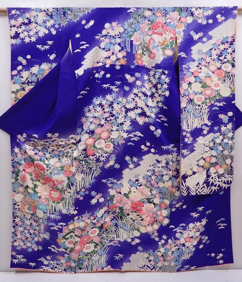 6119T10z1020 Vintage Japanese Kimono Silk FURISODE Flowers Dark lavender