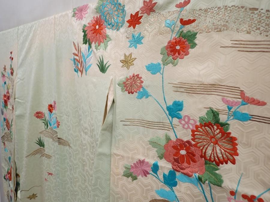 6119T12z1150 Vintage Japanese Kimono Silk FURISODE Chrysanthemum Soft green